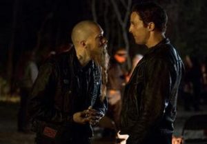 With the case officially lost to the Anti-Christian task force, Marty and Rust decide to “go off book” and Rust develops a plan based on reestablishing his old narco contacts. In a weeks time he reasserts himself amongst “The Iron Crusaders” a motorcycle gang Rust has history with from his undercover days, and whom they’ve come to find out are the sole customers of Ledoux’s meth empire. Now with their table set Rust instructs Marty to wait outside the biker bar and stay on the cell in case he needs him.